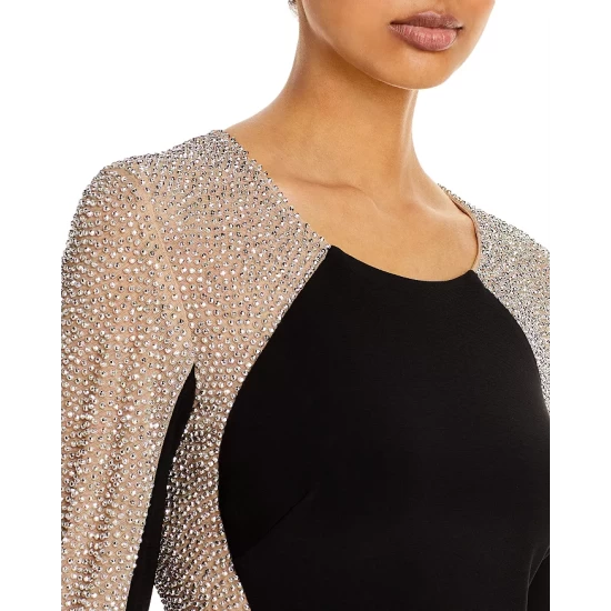 โข Model measurements: 5’10” height, 33.5″ bust, 23.5″ waist, 34.5″ hips, wearing a size 2