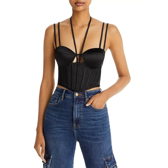 A bustier-style halter top is paired with chic wide-leg trousers in this compliment-worthy look from AQUA x Maeve Reilly.