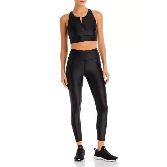 Gear up for a successful workout session with high shine zippered sports bra and matching leggings from AQUA Athletic; layer over with a zipper hoodie for sporty finish.