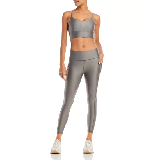Work out in a shiny silhouette with this V-neck sports bra and high rise 7/8 leggings from AQUA Athletic.