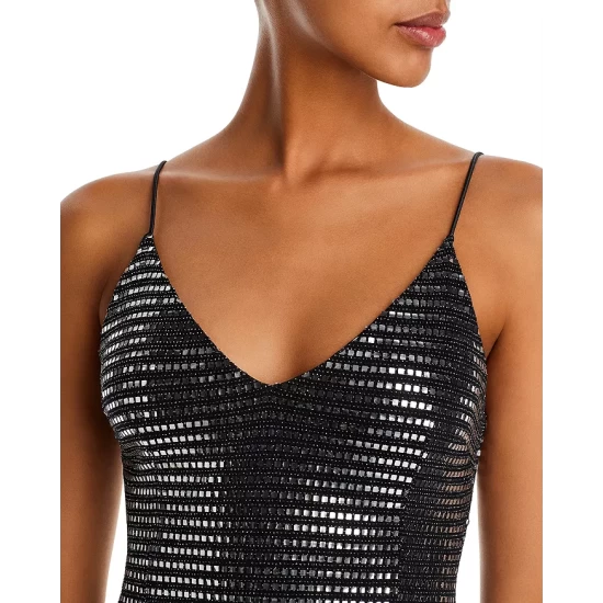 - Self: 87% nylon/8% metallic/5% spandex; lining: 100% polyester
