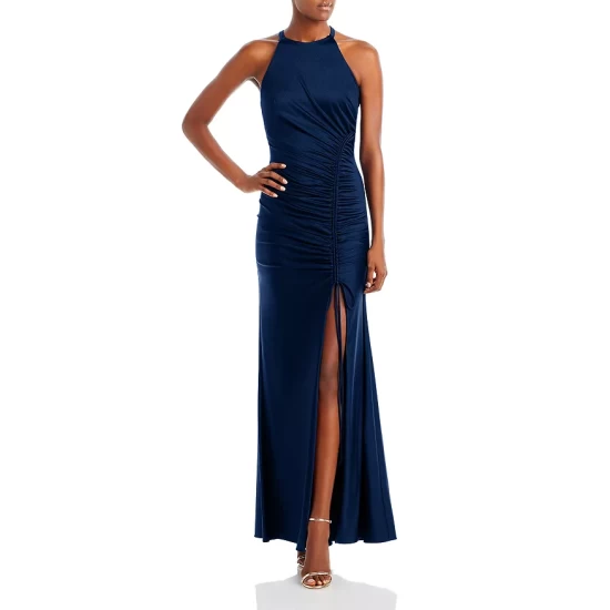 - Asymmetric ruched seam detail with adjustable ties and front slit