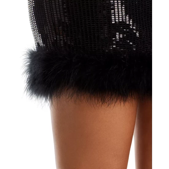 - Self: polyester/LUREXยฎ/spandex; trim: ostrich feathers; lining: polyester