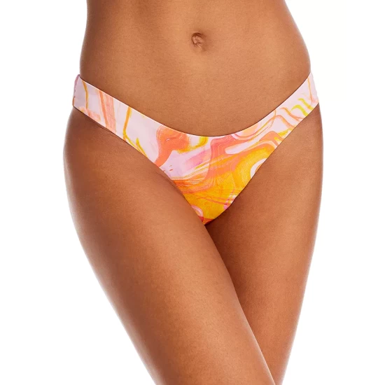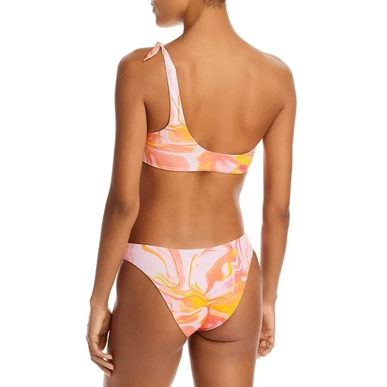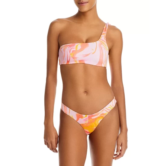 A painterly swirl print lends artful edge to AQUA Swim’s colorful one-shoulder top and matching bikini bottom.